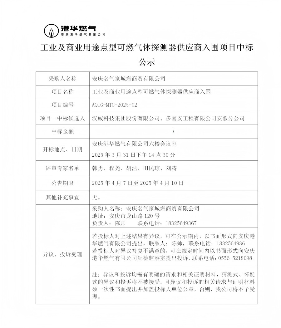 工業(yè)及商業(yè)用途點型可燃氣體探測器供應(yīng)商入圍項目中標公示