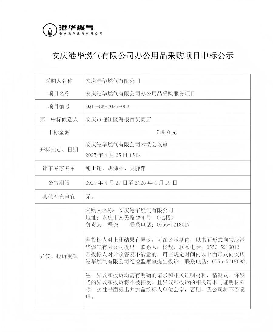 安慶港華燃氣有限公司辦公用品采購項目中標(biāo)公示