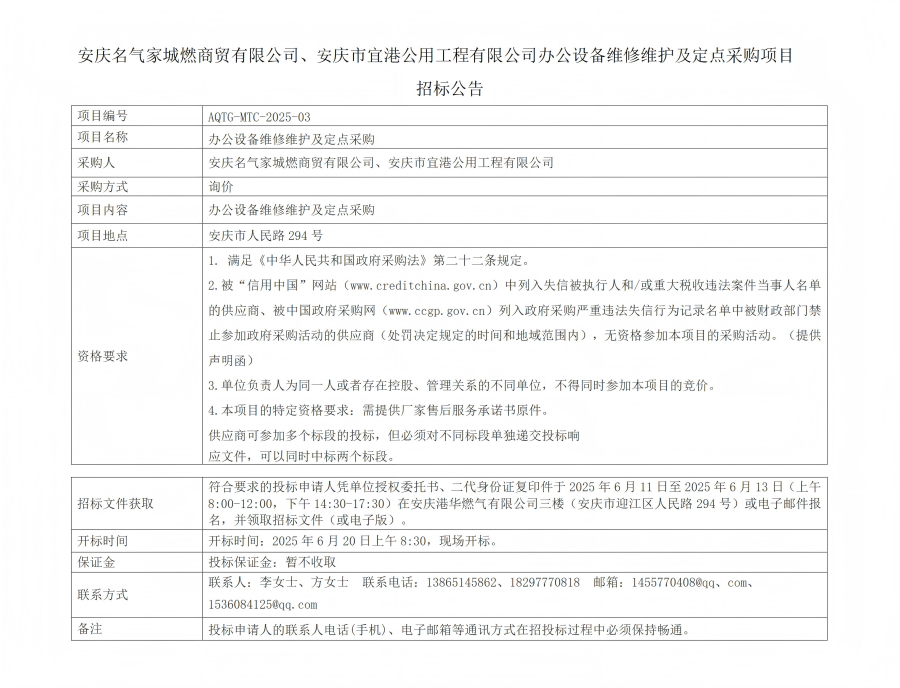 安慶名氣家城燃商貿(mào)有限公司、安慶市宜港公用工程有限公司辦公設(shè)備維修維護(hù)及定點采購招標(biāo)公告