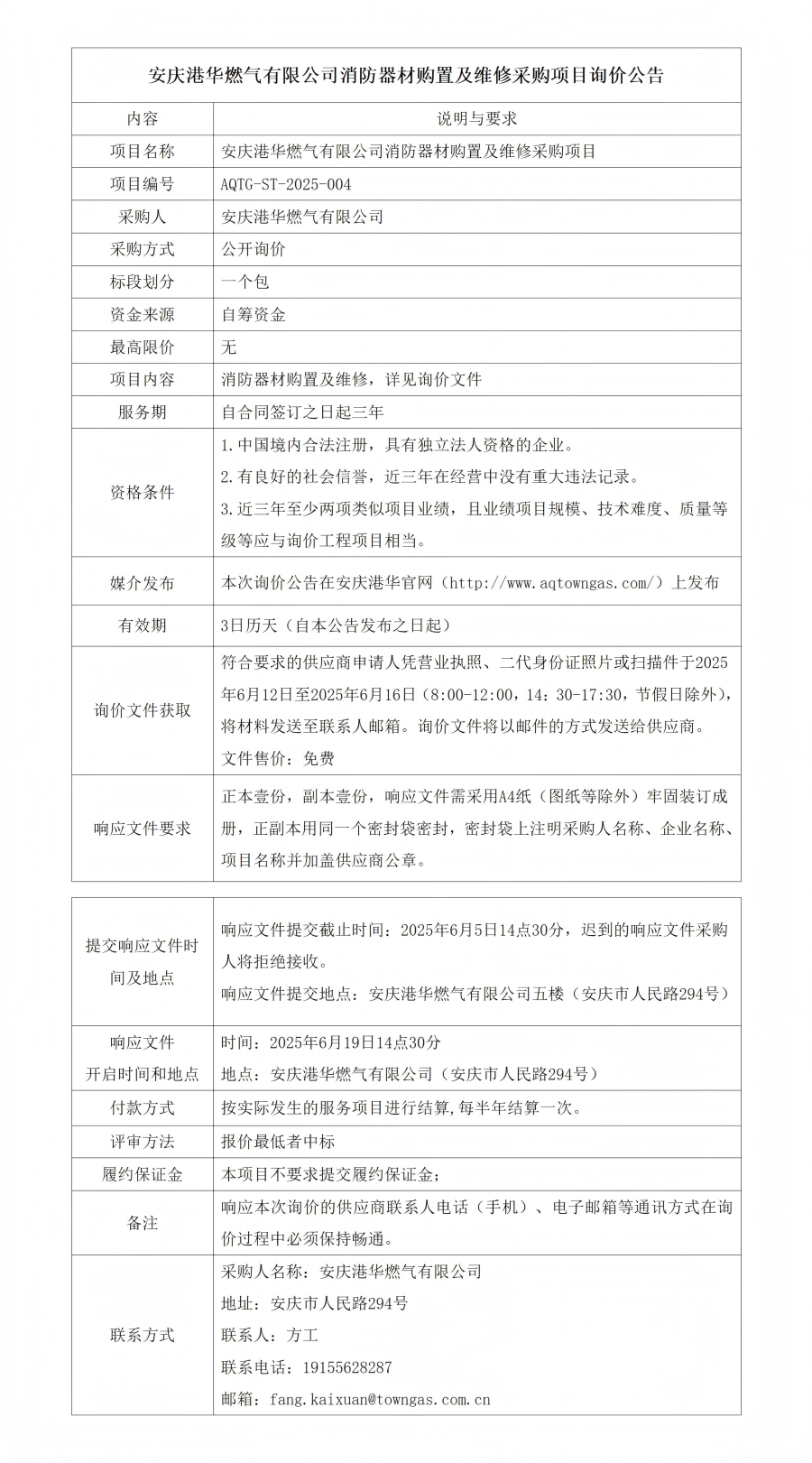 安慶港華燃氣有限公司消防器材購置及維修采購項目詢價公告