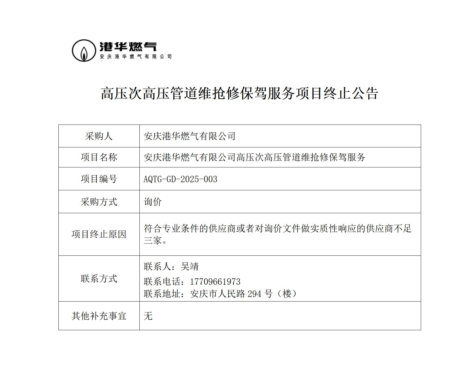 高壓次高壓管道維搶修保駕服務(wù)項(xiàng)目終止公告